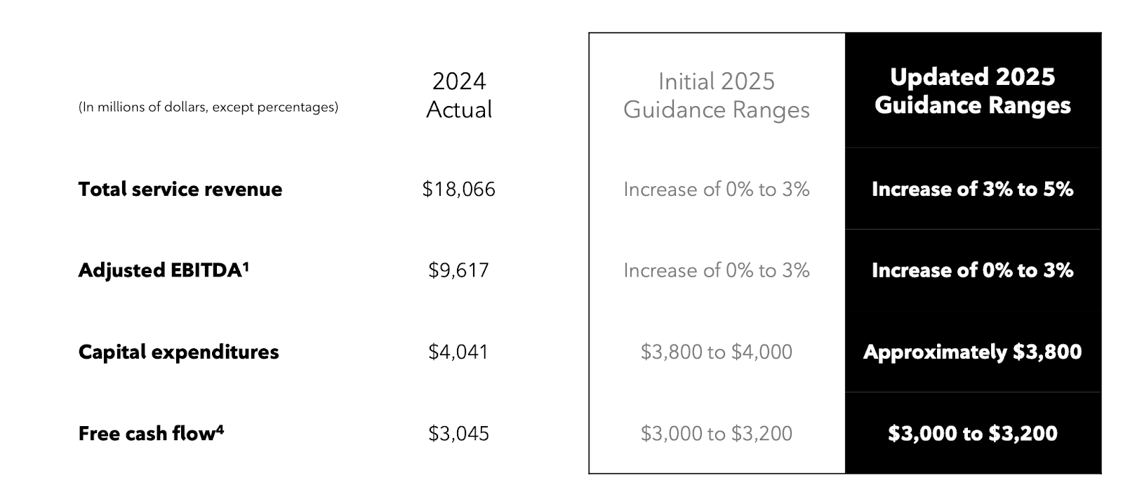 In 2024, Rogers Communications saw $18.1 billion CAD or $13.1 billion USD in revenue, $9.6 billion CAD or $7 billion USD in EBITDA, capital expenditures of $4 billion CAD or $2.9 billion USD, and free cash flow of $3 billion CAD or $2.2 billion USD. This means an EBITDA margin of 53.23% and a free cashflow conversion rate of 31.64%. Their 2025 guidance includes revenue growth of 3-5%, EBITDA growth of 0-3%, capital expenditures of $3.8 billion CAD or $2.7 billion USD, and free cash flow of $3-3.2 billion CAD or $2.17-$2.3 billion USD.
