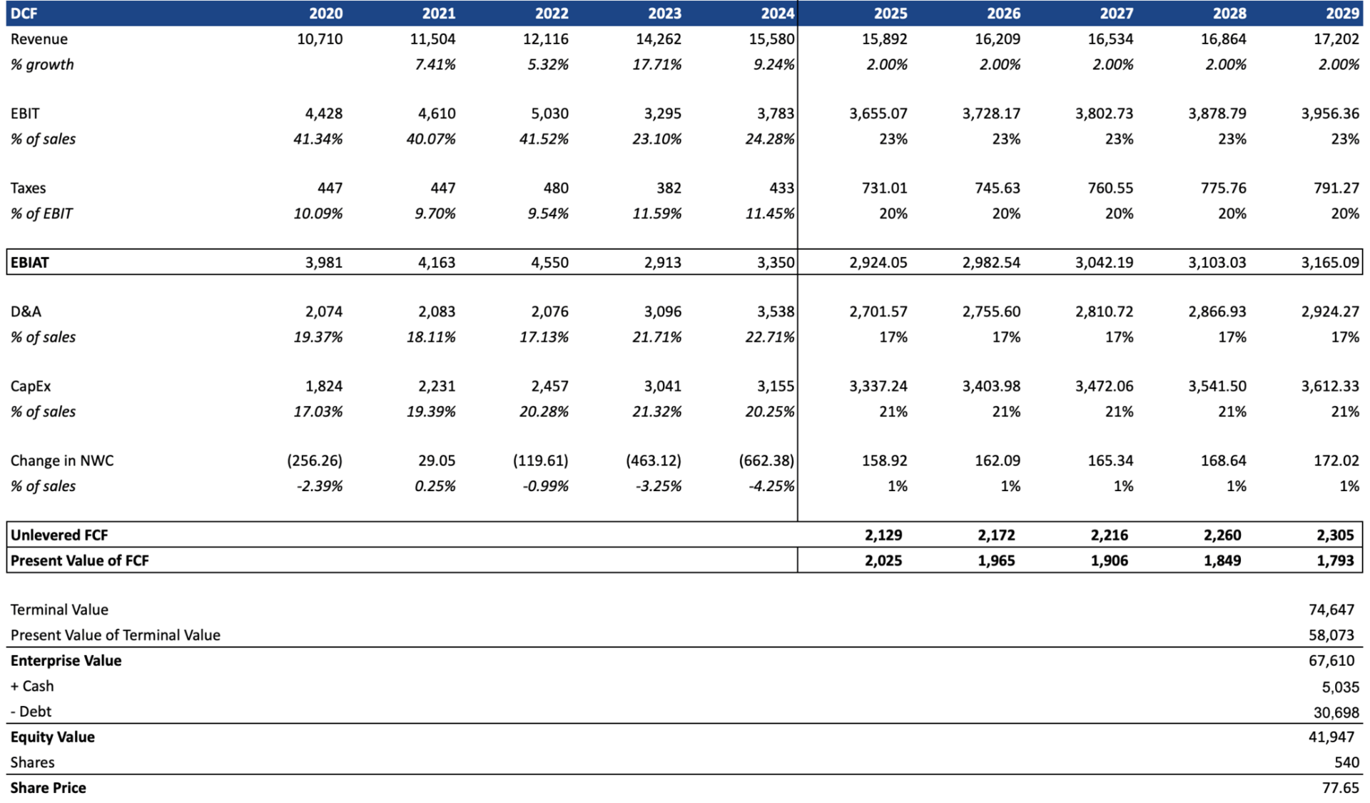 Rogers Communications has a price to earnings ratio of 14.78, an enterprise value to EBITDA ratio of 6.54, and an enterprise value to revenue ratio of 3.45. A comparison of these ratios to the ratios of comparable stocks is attached below. A price to earnings ratio of 27.21 is seen when averaging the price to earnings ratios of Rogers Communications and comparable stocks. Applying this multiple to Rogers Communications which had earnings per share of $2.43 USD in 2024, a share price of about $66 is seen. A EV/EBITDA ratio of 7.99 is seen when averaging the EV/EBITDA ratios of Rogers Communications and comparable stocks. Applying this multiple to Rogers communications, which had an EBITDA of $6.9 billion USD in 2024, an enterprise value of $55 billion USD is seen. Accounting for cash, debt, and share count, an enterprise value of $55 billion USD means a share price of about $54. An enterprise value to revenue ratio of 2.01 is seen when averaging the enterprise value to revenue ratio of Rogers Communications and comparable stocks. Applying this to Rogers Communications, which had 2024 revenues of $13 billion USD, means an enterprise value of $13.6 billion USD which equates to a share price of about $25.